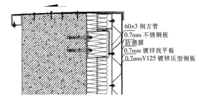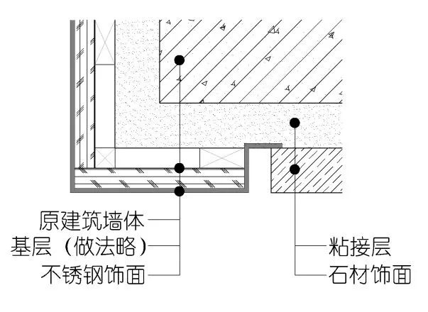 (2)根据设计要求,可考虑设置不锈钢凹槽,同时石材侧边需要抛光打磨,不锈钢伸进去,石材扣压住不锈钢(见CAD图),能有效处理好两种材料间的收口。
