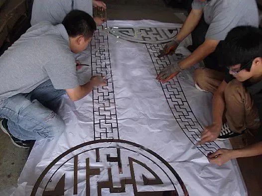 (5)加工、安装过程中,保护膜如有脱落要及时补贴。加工操作台上需铺一层软垫,防止划伤金饰面板;