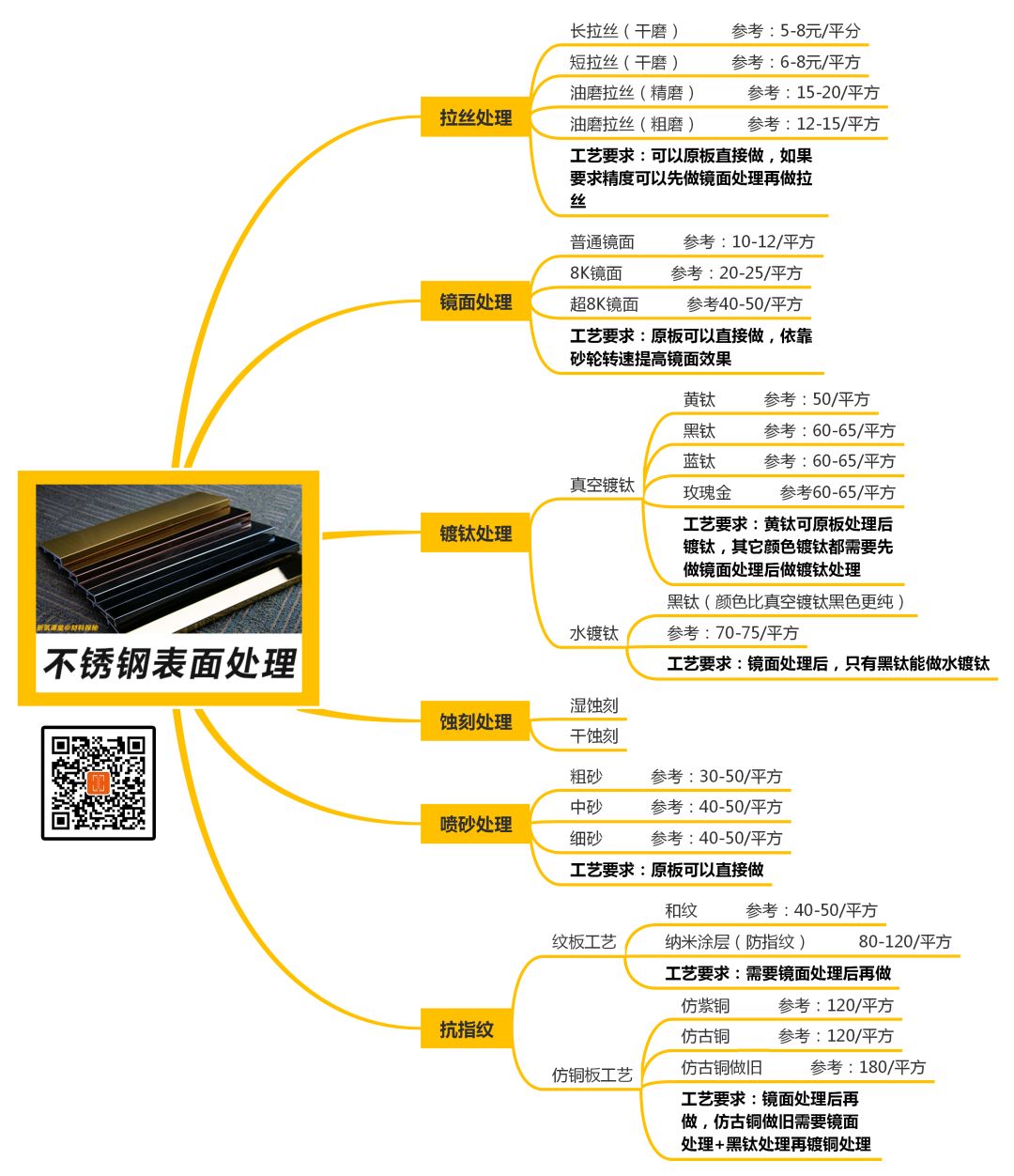 和你一起总结不锈钢表面处理的工艺,另外不同表面处理的价格参照也是我们重点要了解的: