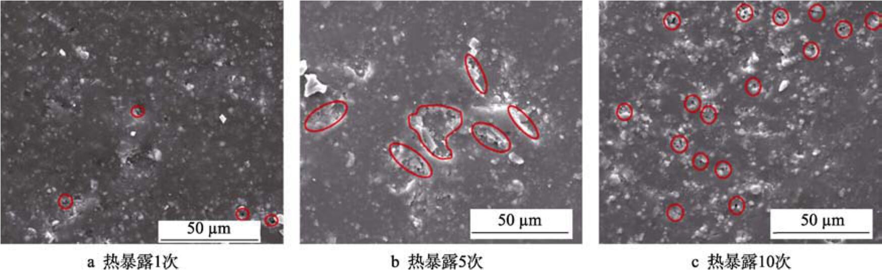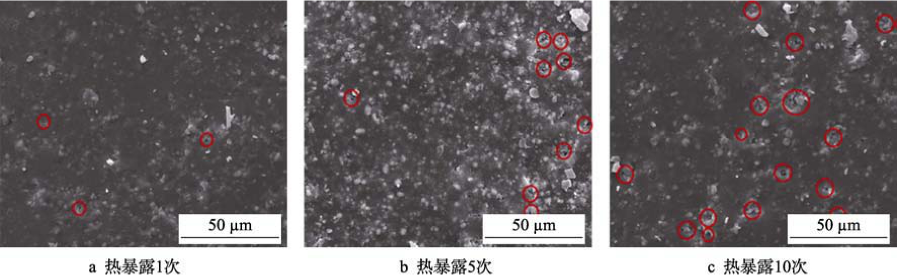 图2为涂层在1250 ℃热暴露之后的表面形貌,图3为涂层在1300 ℃热暴露之后的表面形貌。由图2和图3观察可以发现,在1250 ℃和1300 ℃下热暴露之后,涂层宏观上仍旧保持完整,无断裂、剥落或裂纹现象出现。但是,涂层热暴露之后,其表面出现不同数量的微孔,且微孔数量随热暴露次数的增加而增多。从图2a、2b可见,1250 ℃下热暴露1次和5次后,涂层表面有少量微孔或凹坑出现,且微孔深度较浅;从图2c可见,热暴露10次后,涂层表面微孔数量明显增多且微孔深度较之前更深。由图3观察发现,1300 ℃下热暴露 5次后就出现众多深度较深的微孔,且热暴露10次后,出现的微孔有逐渐扩大连接在一起的趋势。此外,从图2和图3可以发现,热暴露之后,微孔基本上都出现于辐射剂颗粒团聚的区域。