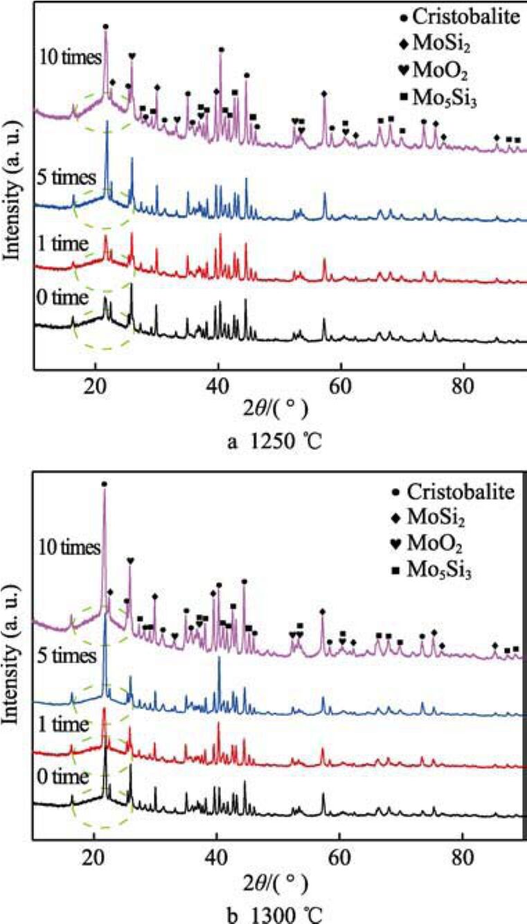 图6为涂层热暴露之后的物相分析图谱,其中0次为烧结之前试样。由图6可得,整体上来说,涂层热暴露之后没有新相产生,可看到 15°~25°范围内有玻璃相对应的特征“馒头峰”,并伴有方石英相、MoO2相、Mo5Si3相和原辐射剂成分MoSi2相,即涂层热暴露前后均为以玻璃相为主的多相复合涂层。由于辐射剂成分MoSi2相在高温下发生了热氧化,导致涂层中生成了MoO2相和Mo5Si3相,具体反应过程如反应方程(1)和(2)所示。而物相分析未检测到 SiB4的原因在于,玻璃相对 SiB4颗粒具有包裹作用以及其发生了热氧化反应(如反应方程(3)所示)。此外,观察图6后发现,在1250 ℃和1300 ℃下热暴露之后,涂层均有不同程度的析晶现象,析出相为方石英相,且随着热暴露次数的增加,析出方石英相的含量也逐渐增多,主要原因是热暴露过程中涂层内原有晶核的长大。在方石英质量分数少于5%时,涂层仍可安全服役,但是随着方石英含量增多后,将会影响涂层高温下的性能。从高温降温至低温过程中,在267 ℃左右方石英会发生由β相向α相的二级相变,该过程会伴随有约 2.8%的体积效应[14],这将会加剧涂层与基体之间热膨胀系数不匹配问题。因此,若涂层中方石英含量过大,将会降低涂层的高温使用性能和尺寸稳定性。