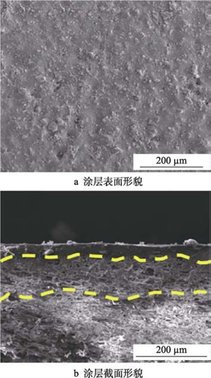 Fig.1 Morphology of coating before thermal exposure:(a) surface morphology of coating;(b) cross-section morphology of coating