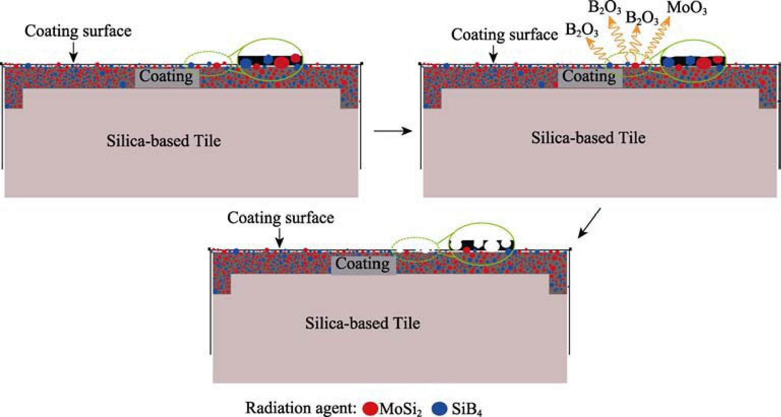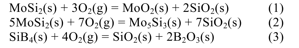结合涂层的形貌表征结果(图1a)和物相表征结果(图6)可知,表面涂层是以硼硅玻璃相为主体且伴以辐射剂成分 MoSi2相及其热氧化产物的多相复合涂层材料,在涂层制备烧结过程中,硼硅玻璃相受热软化熔融扩展而将辐射剂颗粒包裹起来,避免了辐射剂颗粒(MoSi2、SiB4)在高温环境中与氧气的直接接触,起到保护辐射剂颗粒的作用。