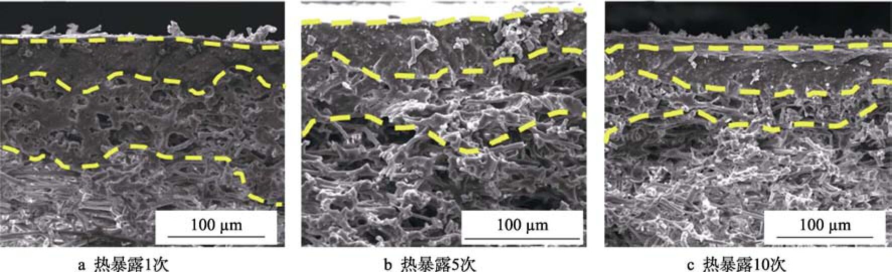 图4为涂层在1250 ℃下热暴露之后的截面形貌。由图4可见,1250 ℃下热暴露后,涂层纵向结构仍然为完整的三段式双层涂层结构,过渡层与表面涂层和基体的结合仍旧紧密,过渡层可继续缓解表面与基体之间的热膨胀差异。仔细对比图4a、b、c微观结构可发现,随着涂层热暴露次数的增多,中间过渡层的网状结构有逐渐烧结变密的趋势,但是并不会明显影响过渡层的作用。过渡层在热暴露10次后,相比于热暴露1次,其孔隙分布不均匀且有多孔隙烧结后连接的迹象,但整体上过渡层结构仍旧完整,并未遭到破坏。