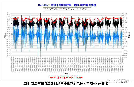 由于地铁运行特征、地铁与管道之间位置关系的影响,导致管道上受到的杂散电流干扰大小、方向复杂多变,常规排流器无法应对这种大小、方向不断变化的杂散电流,见图1、图2、图3。