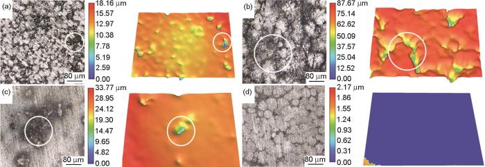 为进一步确定不同钝化电位产生的本质原因,将合金中的致钝电位中较低的称为1号电位,较高电位称为2号电位 (图6),并在1号电位处进行2 h恒电位极化处理,采用三维体视显微镜对极化后的试样形貌进行观察,结果如图7所示,其中,图中白色圆圈内为优先腐蚀的相。Al0和Al0.25合金中均有一相优先溶解,由图3a和4a中EPMA和Volta电位分布结果可知:上述两种合金中优先溶解的相均为Fe-Cr-Mn枝晶相,较高致钝电位则对应FeMnNi相。Al0.5合金试样在施加恒电位极化后只有少部分相,即硬质相ρ相优先溶解 (图4),而基体虽有2相组成,但未表现出明显的某一相优先溶解的特征。对于Al0.75合金试样,恒电位极化之后,表面虽然产生了腐蚀形貌,但未有明显的高低起伏,即两相的溶解速率几乎相同,这是由于Fe-Cr-Mn相和Al-Ni-Mn相 (b2相) 电化学活性相差不大,二者均匀溶解所致。