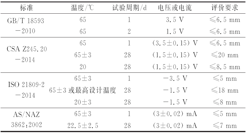 管线在服役过程中,周围环境等都可能会为杂散电流或腐蚀电池的形成提供条件,管线铺设完成后大都采用阴极保护措施,这就需要涂层具有良好的抗阴极剥离性能。因此各标准中的试验方法都是模拟阴极保护过程,以观察和评价涂层的附着力和抗阴极剥离性能。