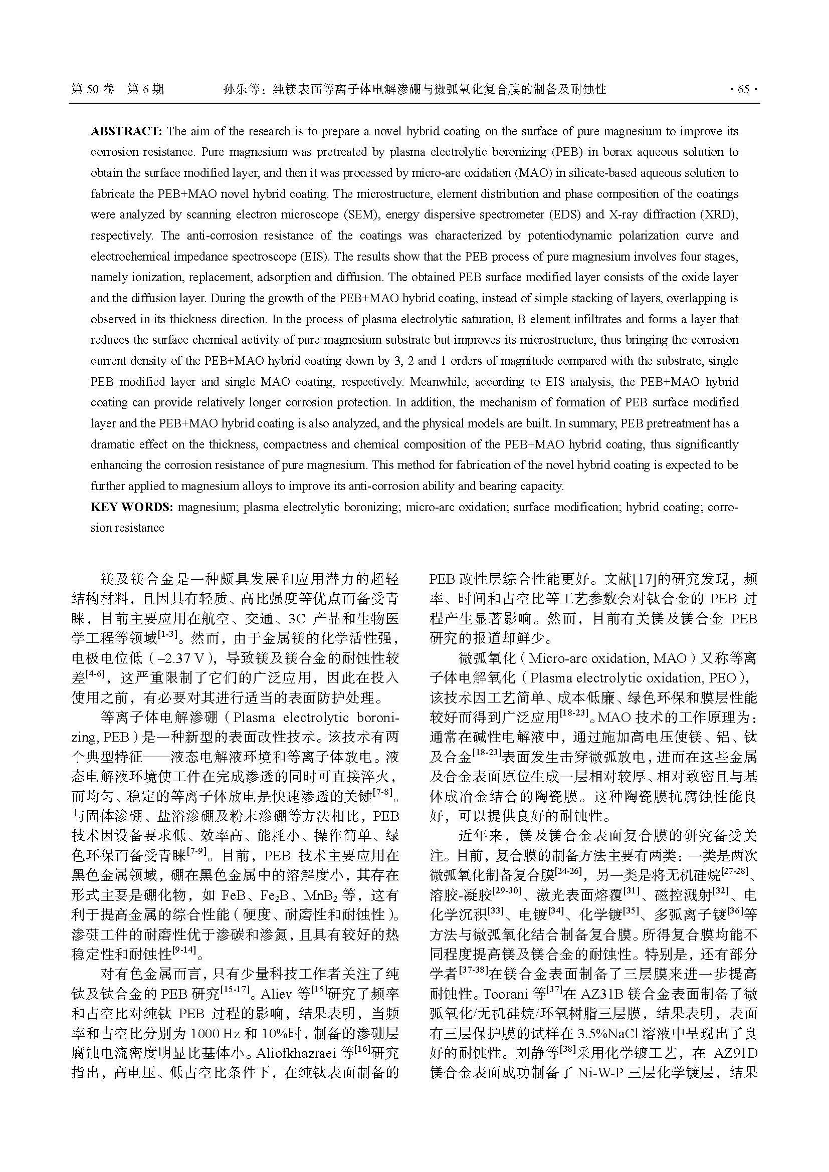 纯镁表面等离子体电解渗硼与微弧氧化复合膜的制备及耐蚀性