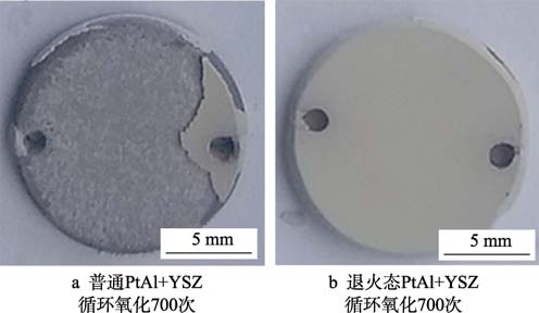 图2a 为普通PtAl+YSZ 体系热循环700 次的宏观形貌,样品表面出现大面积的剥落而失效。没有退火处理的情况下,PtAl+YSZ 热障涂层样品坚持到687个循环不发生剥落,这与B. Baufeld 等人在相似考核条件下的热循环寿命基本相同[13]。图3b—d 为经退火处理后的PtAl 粘结层样品,700 次热循环后表面未发现剥落(边缘除外),1000 次循环后悬挂孔附近发生少量剥落,直至1282 次热循环后出现大面积剥落,样品彻底失效。从以上结果可以看出,PtAl 粘结层真空退火后,热障涂层体系样品的循环寿命远大于粘结层未经退火处理的样品寿命。这主要是因为退火处理后的PtAl 粘结层表面更加平整,表面缺陷、尖端凸起和残余应力得到有效消除,使得在EB-PVD 法沉积陶瓷层过程中生成的氧化膜更平整,陶瓷层的粘附性更好。在长时间热循环测试过程中,退火态PtAl 粘结层的热障涂层样品表现出更优异的抗循环氧化性能,与文献报道结果一致[10]。