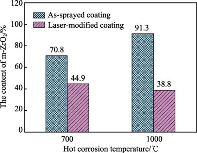 图7 喷涂态和激光改性涂层在700、1000 ℃的V2O5熔盐中腐蚀4 h 后m-ZrO2 含量