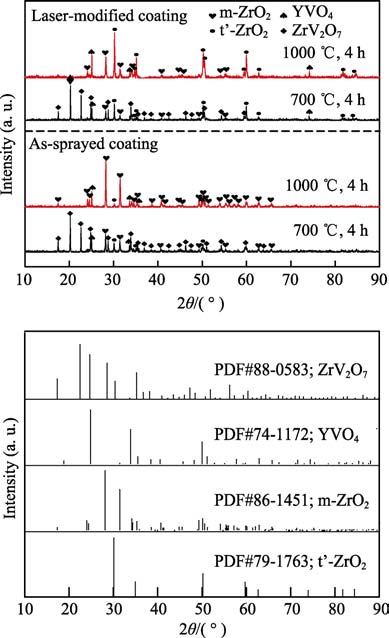 2)在700 ℃和1000 ℃的V2O5 熔盐中腐蚀4 h后,改性涂层和未改性涂层的腐蚀产物种类相同:700 ℃下为ZrV2O7 和YVO4,1000 ℃下为m-ZrO2和YVO4。但是改性涂层腐蚀后产生的m-ZrO2 含量更少,表明激光改性可提高涂层中的t’相稳定性。