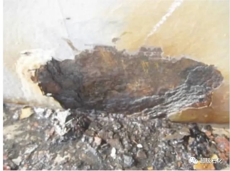 储罐壁板外侧的腐蚀重点关注与罐壁相连的易积水部位,如保温储罐加强圈部位、抗风圈踏板与罐壁焊接部位、罐壁连接件部位等。某油库保温储罐在运行过程中出现过加强圈部位罐壁腐蚀造成的储罐泄漏事故。保温储罐加强圈部位罐壁的腐蚀状况见图3。