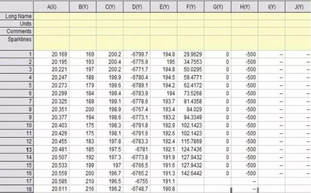 Step2: 导入后数据如下,A列是你的角度,B是obs,C是calc,D是obs-calc,E是背景可以删除,F是Bragg position,G全部为零要保留,后面的晶面指数全部删除。