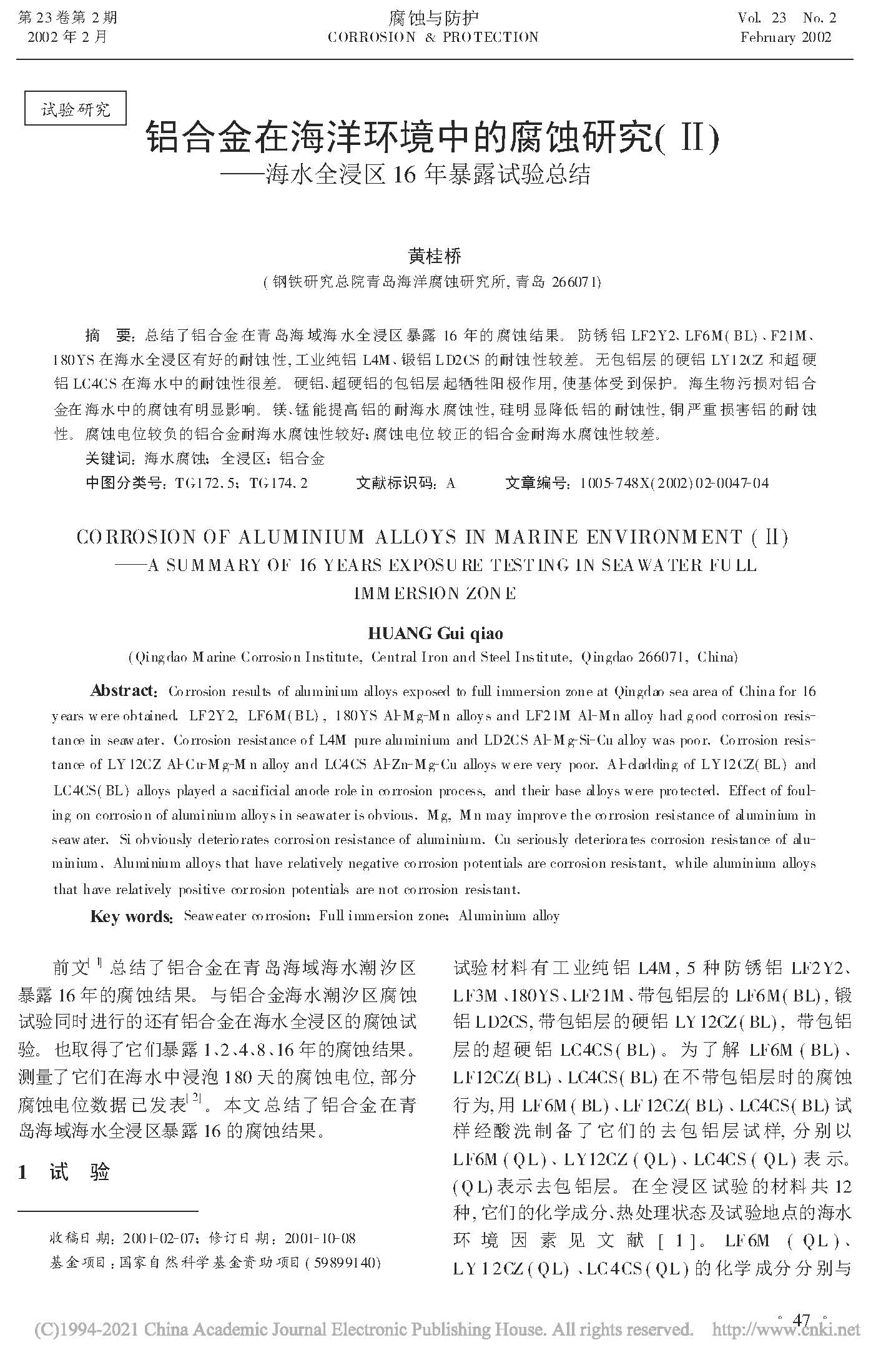 铝合金在海洋环境中的腐蚀研究(Ⅱ) ———海水全浸区16年暴露试验总结