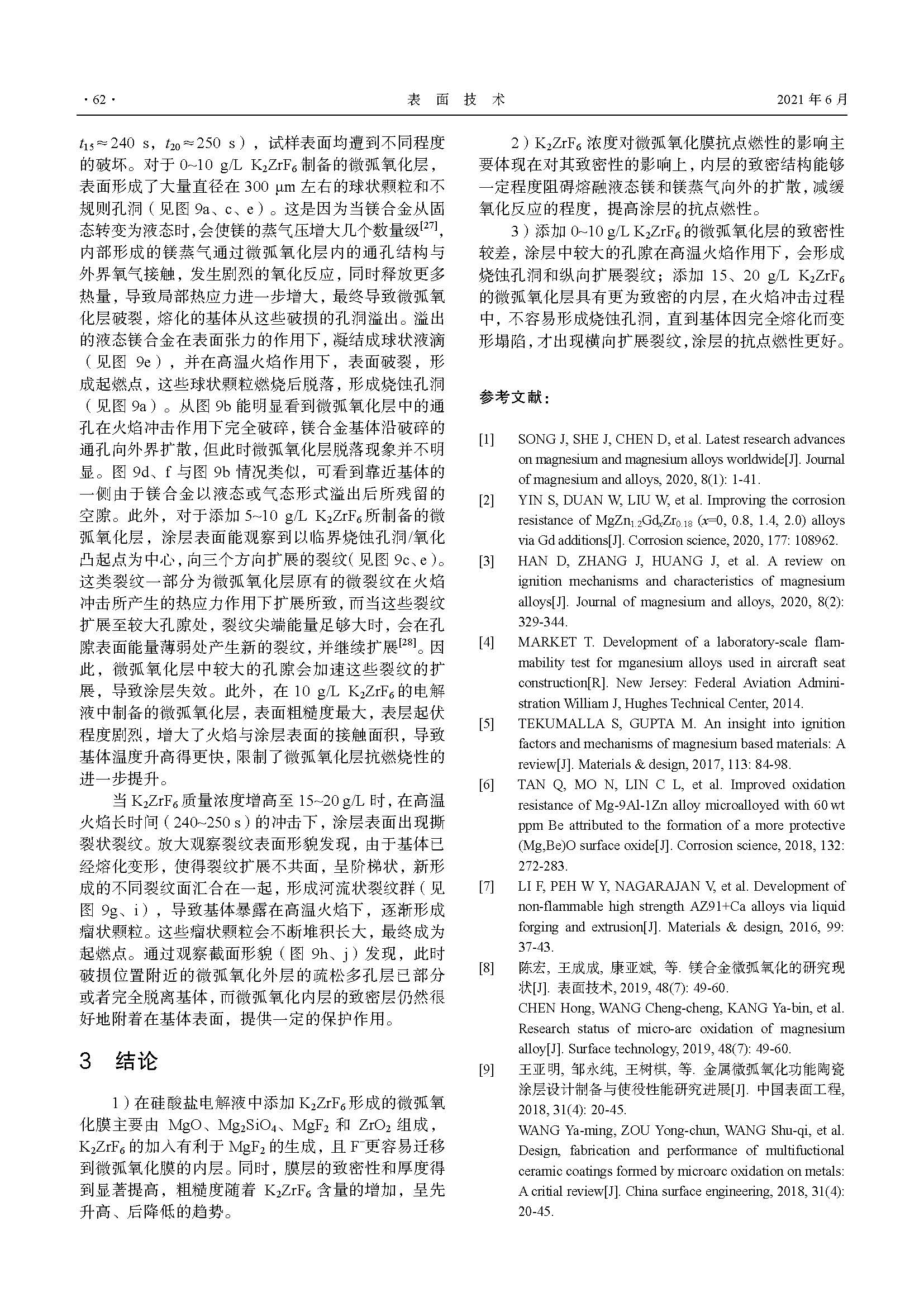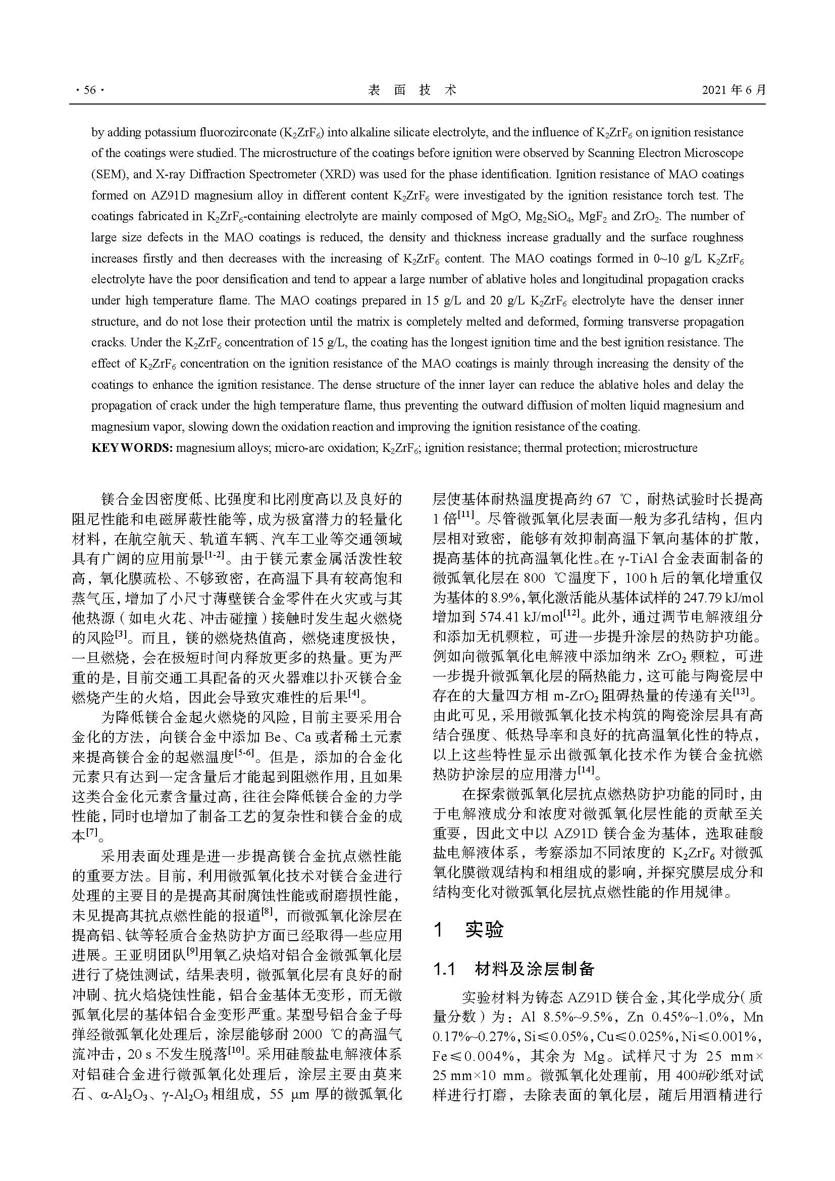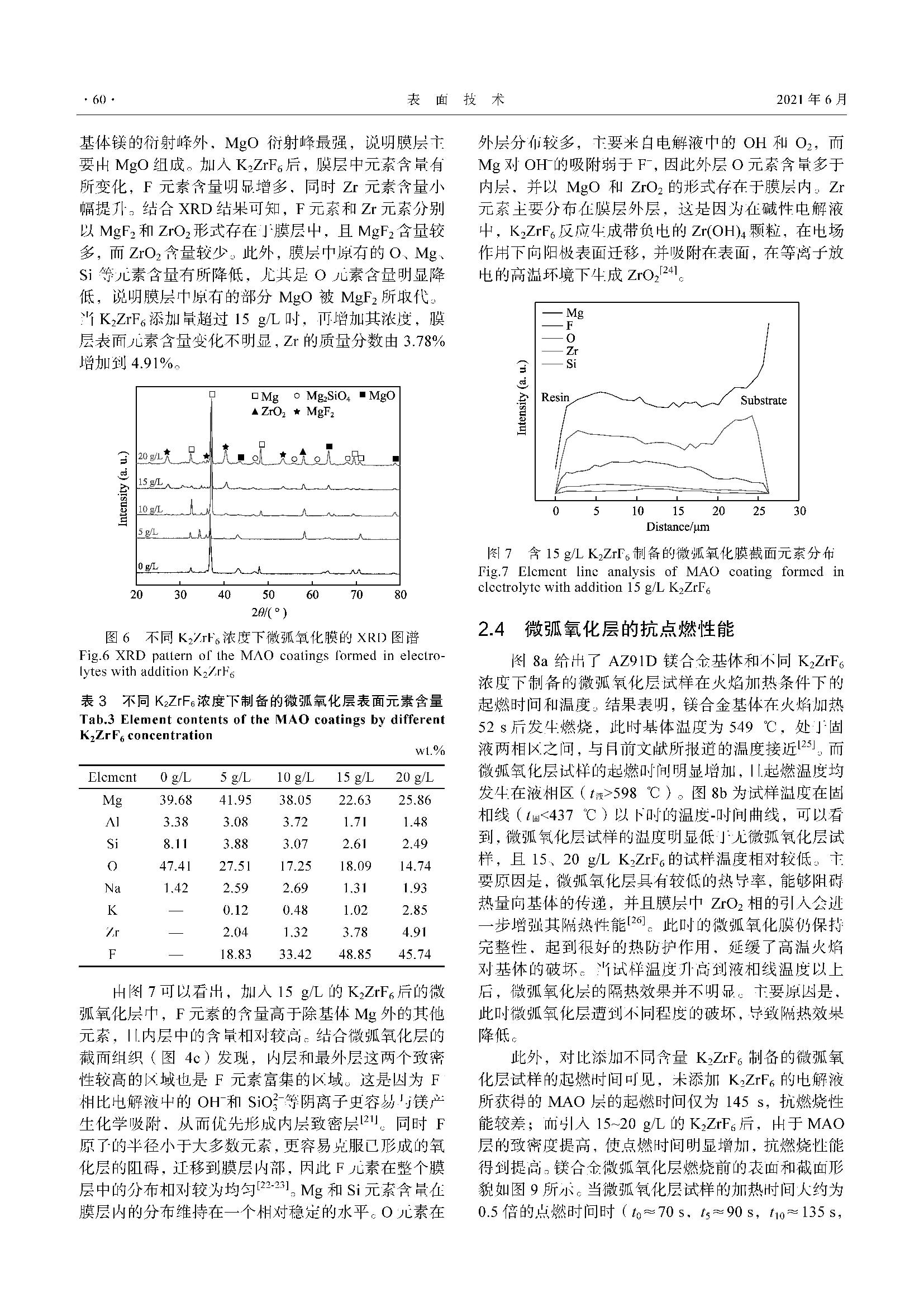 K2ZrF6 对镁合金微弧氧化膜抗点燃性能的影响
