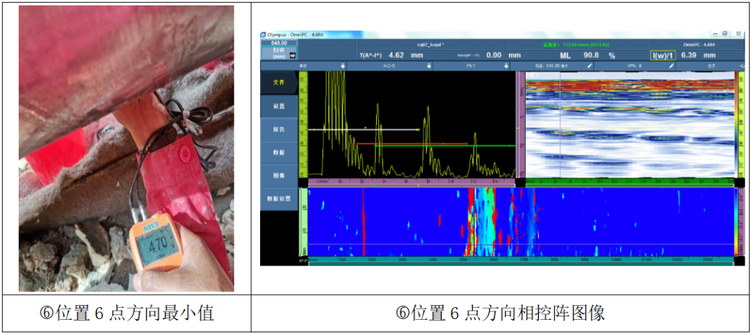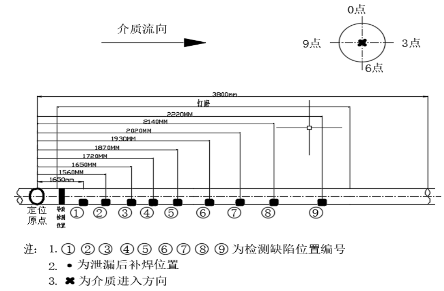 其中9#探坑检测发现问题描述:此处采取超声壁厚、超声相控阵、漏磁检测方法对整段管道进行100%全覆盖,现场检测部位及缺陷位置示意图见图3、4所示,检测共发现9处明显壁厚减薄处,其中③处最小实测壁厚为3.62mm,检测发现缺陷汇总见表2所示。
