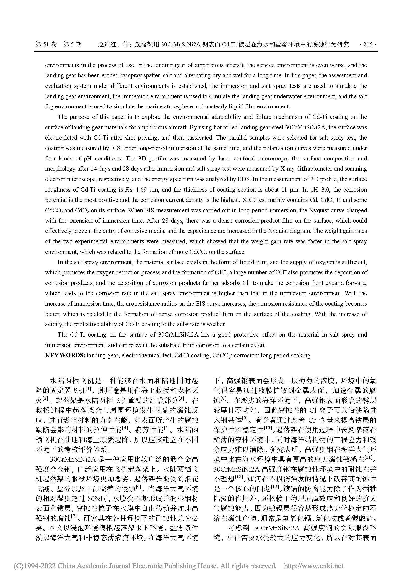 起落架用30CrMnSiNi2A钢表面Cd-Ti 镀层在海水和盐雾环境中的腐蚀行为研究