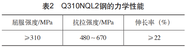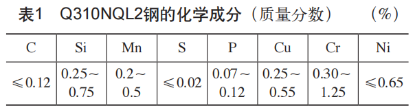 试验材料为板厚2.5mm的Q310NQL2钢及板厚3mm的Q345NQR2钢,对试验材料表面进行喷砂处理后进行电阻点焊试验。试验材料的化学成分及力学性能分别见表1~表4。