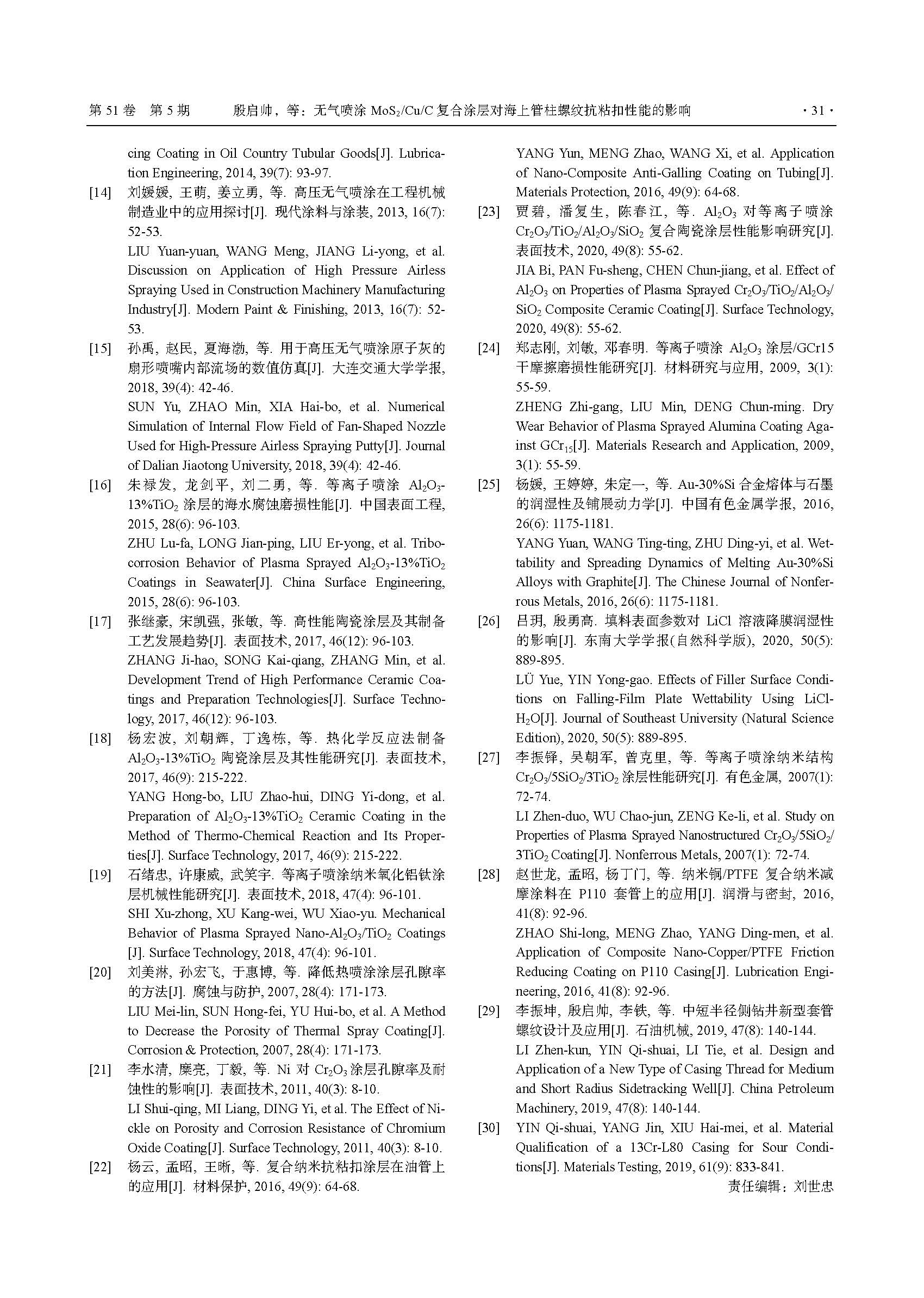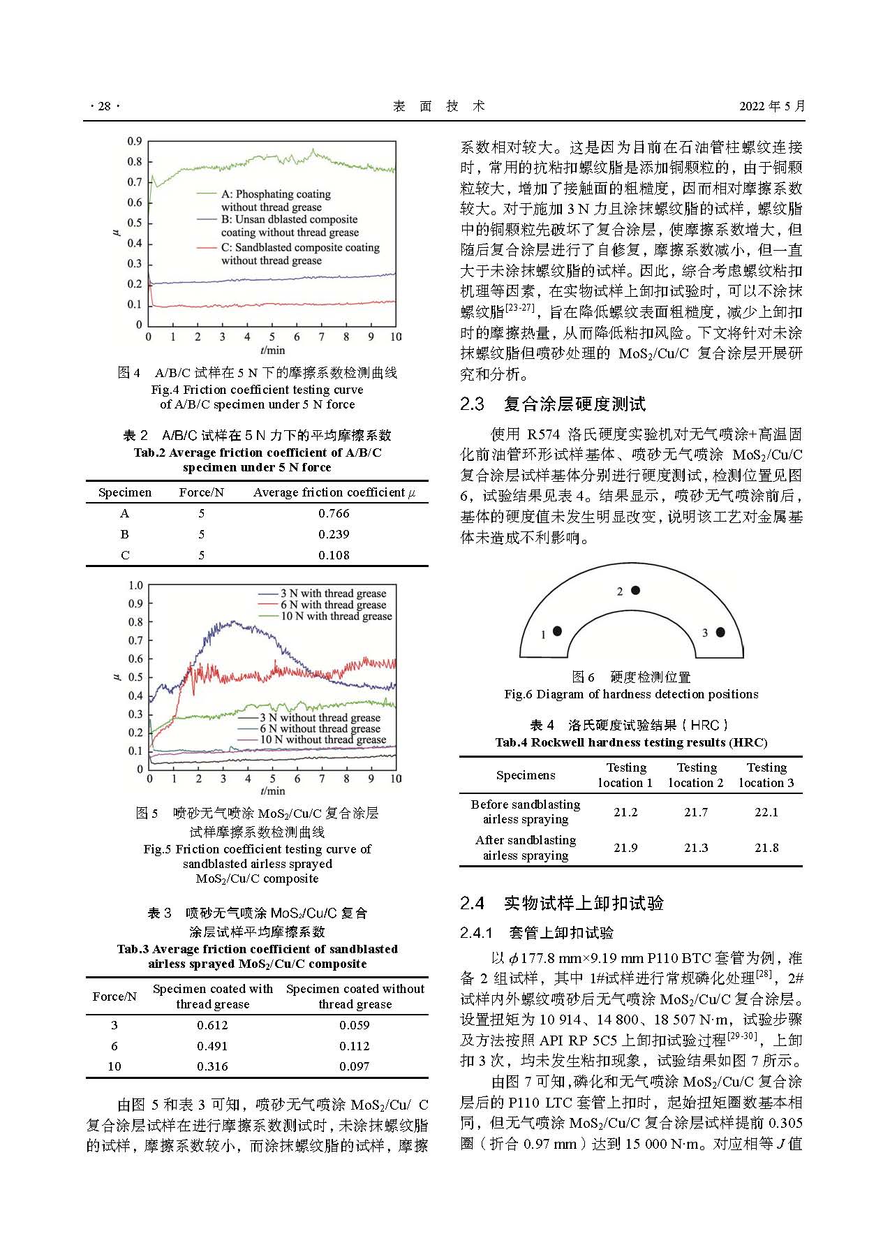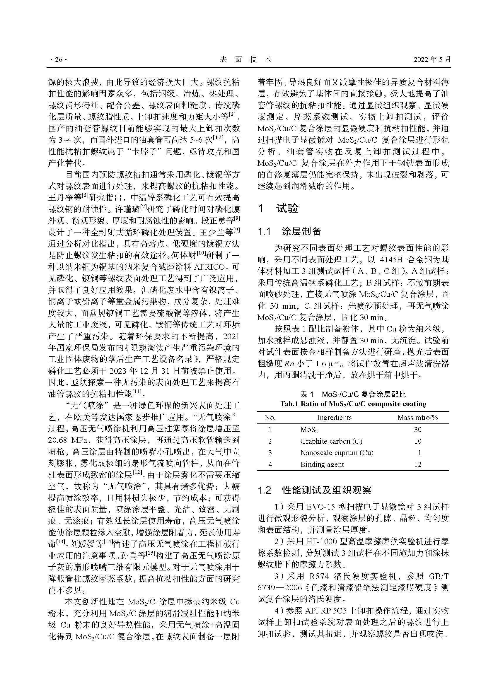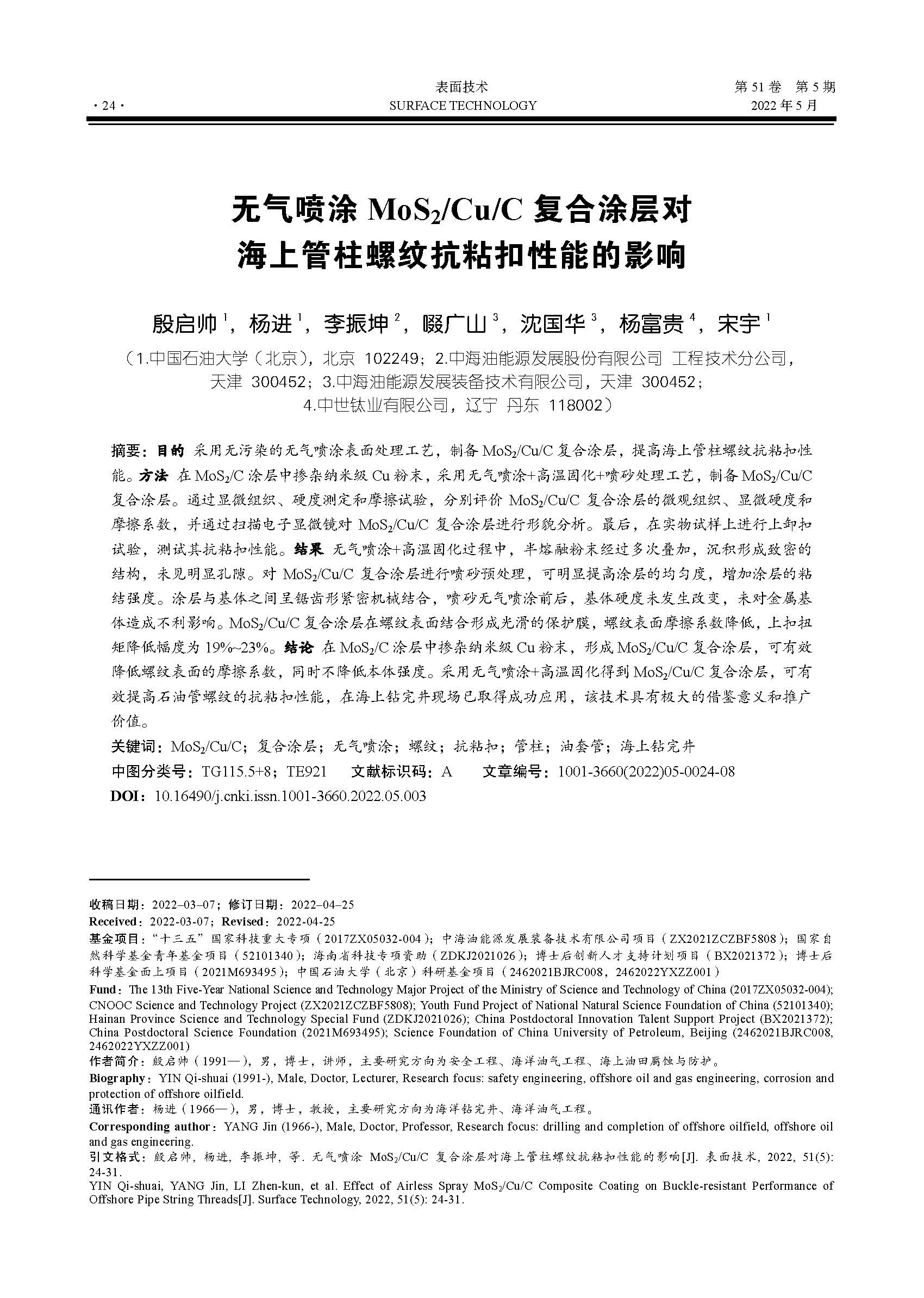 无气喷涂 MoS2/Cu/C 复合涂层对海上管柱螺纹抗粘扣性能的影响