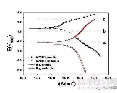 只要当两种材料的腐蚀电流大体相同时,腐蚀电位才是一个需要考虑的参数,腐蚀电位越高,材料的耐蚀性能越好。举一个例子可以有助于更好的理解这句话,图8:当电位为a时,纯镁处在腐蚀电位,纯镁发生腐蚀;而AZ91D镁合金则处在阴极状态,没有发生腐蚀。当电位为b时,纯镁处在阳极电位而发生严重的腐蚀;与之对比,AZ91D镁合金则还处在阴极状态,没有发生腐蚀。当电位为c时,纯镁和AZ91D镁合金都处在阳极电位下,但是AZ91D镁合金的阳极电流则明显小于纯镁,此时AZ91D的腐蚀速度低于纯镁。从上述的三种典型的情况来看,AZ91D合金在各个电位下其溶解电流都小于纯镁,所以可以判断AZ91D合金的耐蚀能力优于纯镁。