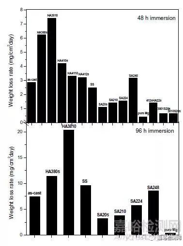 重量法分为增重法和失重法两种,他们都是以试样腐蚀前后的重量差来表征腐蚀速度的。前者是在腐蚀试验后连同全部腐蚀产物一起称重试样,后者则是清除全部腐蚀产物后称重试样。当采用重量法评价工程材料的耐蚀能力时,应当考虑腐蚀产物在腐蚀过程中是否容易脱落、腐蚀产物的厚度及致密性等因素后,在决定选取哪种方法对材料的耐蚀性能进行表征。对于材料的腐蚀产物疏松、容易脱落且易于清除的情况,通常可以考虑采用失重法。例如,通过盐雾试验评价不同镁合金的耐蚀性能时,就通常采用失重法,如图1所示。