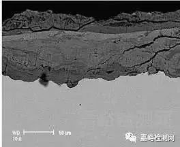 第二,在观察材料的氧化膜截面形貌时,要注意采用扫描电子显微镜的背散射模式进行观察。扫描电镜在腐蚀形貌观察时,通常有两种工作模式,一种是二次电子相模式,一种是背散射模式。二次电子相通过测试二次电子,来获得试样表面的形貌,而背散射模式则可以通过测试背散射电子,获得试样表面元素分布的情况。通过背散射模式观察腐蚀试样氧化膜界面的形貌,可以很容易地分辨出氧化膜内元素的分布,从而判断出氧化膜是单层结构还是多层结构,如图4所示。