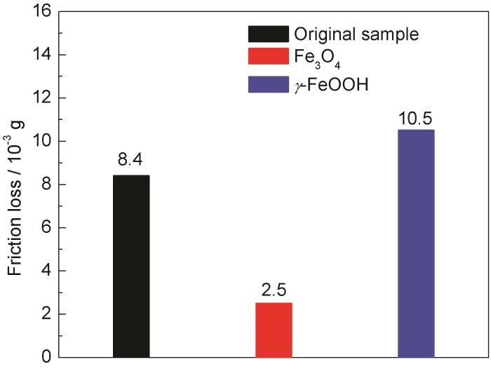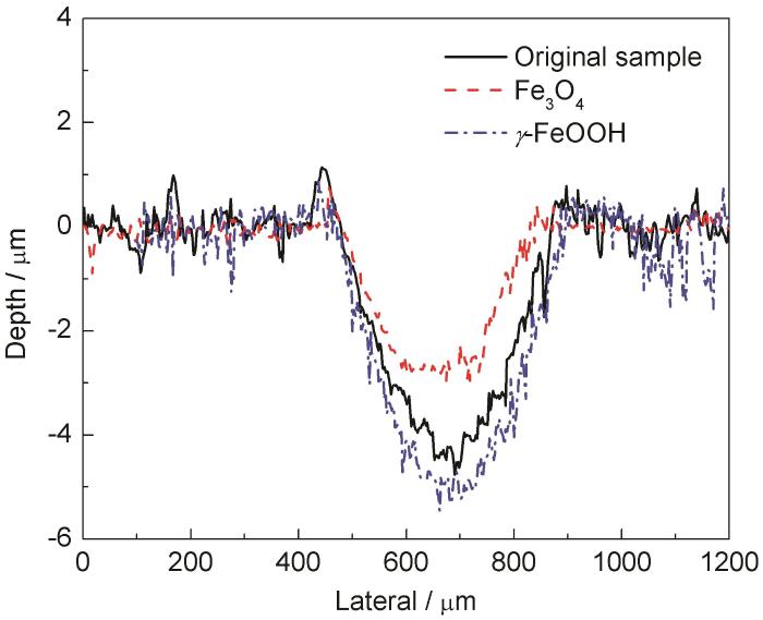 磨损量是指材料受到摩擦的损失量,可以通过测量材料磨损前后的质量或体积变化得到,并称之为质量磨损量或体积磨损量。图8为钢样在盐溶液中磨蚀后的磨痕轮廓截面图,可以看出,磨痕深度最大的是γ-FeOOH层钢样,达到了5 μm,其次是未处理钢样的4.5 μm,磨痕轮廓最浅的是Fe3O4层钢样,为2.8 μm。值得注意的是,磨痕两侧堆积着摩擦腐蚀产物。这主要由于是钢样不仅受到摩擦磨损,还受到腐蚀行为的影响,表面氧化层磨损后,裸露的钢样与海水中的活性Cl-离子接触,增加了局部腐蚀的敏感性,表面更加容易受到点蚀。再观察图9发现钢样的磨损程度与图8的磨痕轮廓截面图规律相似,磨损量由大至小的顺序为10.5×10-3 g (γ-FeOOH层钢样) >8.4×10-3 g (未处理钢样) >2.5×10-3 g(Fe3O4层钢样)。一般来说,磨损质量损失是与摩擦系数成正比的,然而在这种情况下是不同的。有学者报道了类似的结果,摩擦系数随着钢样氧化层附着性能的增加而增加;然而,随着基体与磨屑接触面积的增加,磨损体积损失减小[20]。