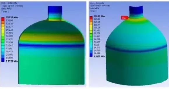 有限元分析结果见图7所示,最大应力强度为139.53MPa,接管与封头连接的局部区域。
