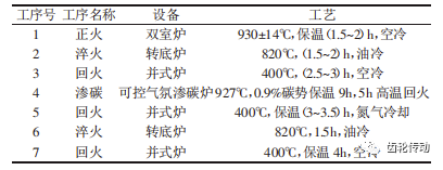 齿轮工作时转速高、传递功率大,承受着交变和冲击载荷,齿和齿之间互相啮合而产生齿面接触应力、齿根弯曲应力。对齿轮一般有以下几方面的要求:齿型面有足够的强度、抗磨损性能、硬度、接触疲劳性能、高的耐磨性以及良好的综合力学性能。上述要求通过热处理来实现,12Cr2Ni4A材料热处理的主要工艺,如表1所示。渗碳前的工艺可以改善零件的性能,渗碳是提高工件表面层含碳量的常用手段,渗碳后材料表层的硬度和耐磨性大幅提高,而芯部的韧性不受影响。深冷处理可以获得稳定的组织,提高材料的使用性能。