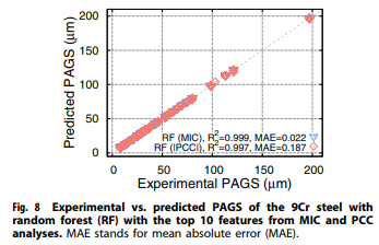 图8.实验和预测的具有随机森林(RF)的9Cr钢的PAGS,具有MIC和PCC分析的前10个特征。 MAE代表平均绝对误差(MAE)。