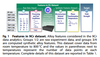 图1 9Cr数据集中的特征 9Cr数据分析中考虑的合金特征。1/2组是原始实验数据,3/4组是计算的合成合金特征。该数据集涵盖了从室温到800°C的数据,温度旁边的括号中的值表示每个温度下的数据点数
