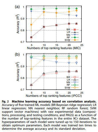 图2.基于相关性分析的机器学习准确性。 以原始实验数据(成分,处理和测试条件以及PAGS)为函数的五个训练过的ML模型(BR贝叶斯岭回归;LR线性回归;NN最近邻;RF随机森林;SVM支持向量机)的准确性 整个9Cr数据集中排名最高的要素的数量。每个模型的超参数最多可进行150次迭代以获得最佳参数。每个模型接受十次训练以确定平均准确度及其标准偏差。
