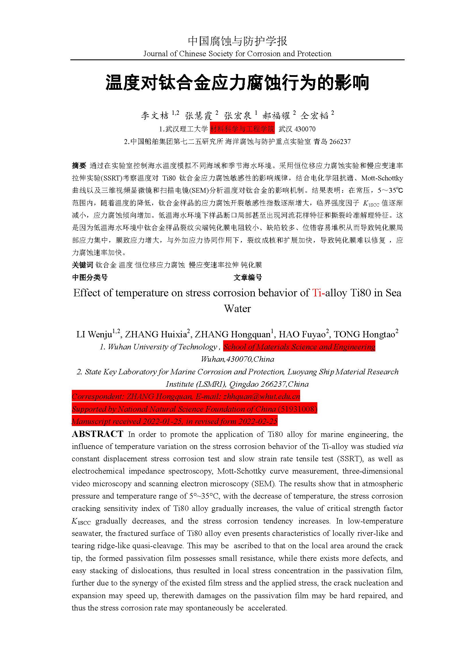 温度对钛合金应力腐蚀行为的影响