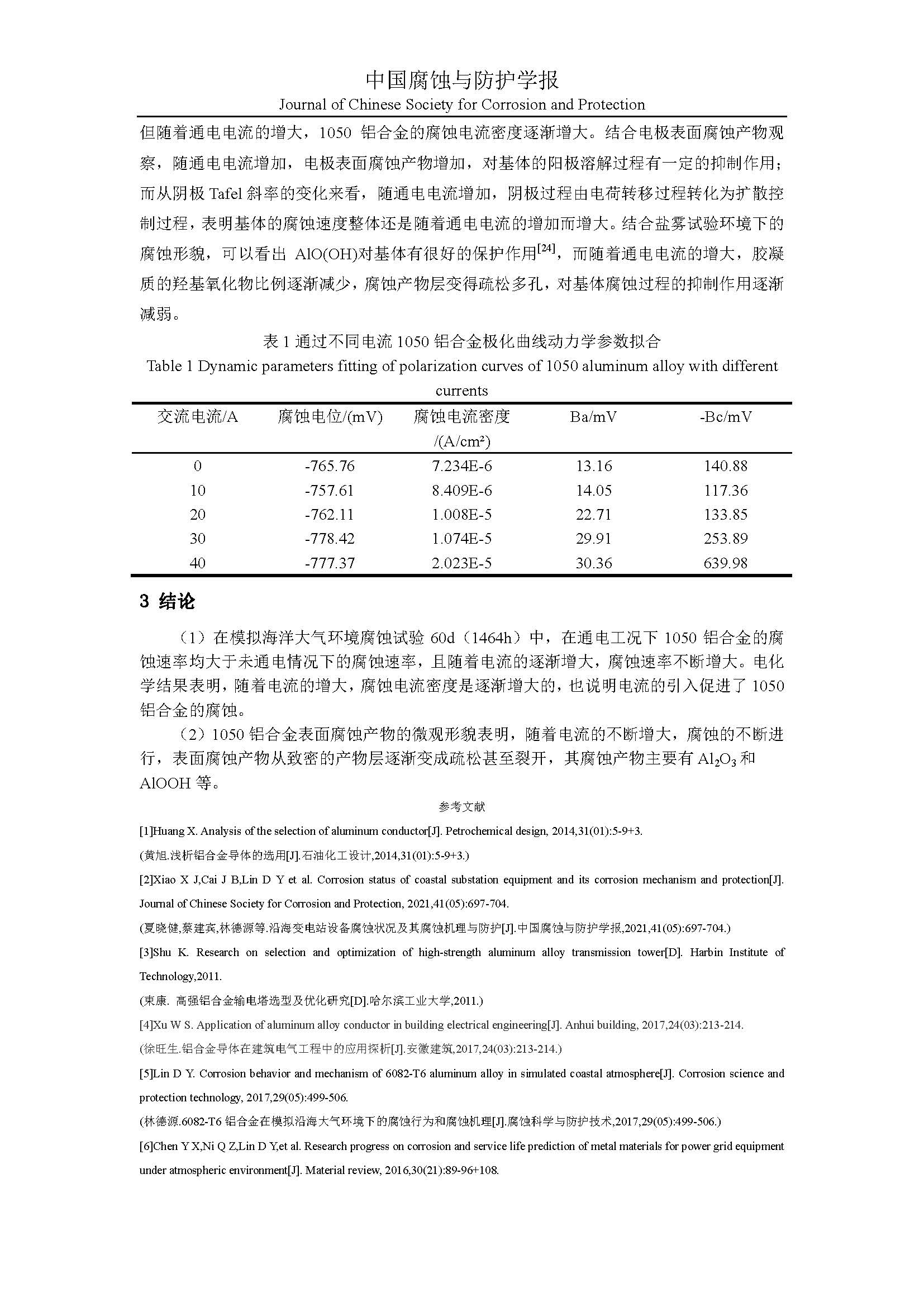 1050 铝合金在通电工况下大气腐蚀的腐蚀特征