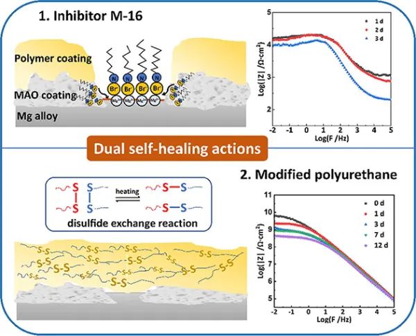 中国科学院兰州化学物理研究所研究员梁军团队基于负载缓蚀剂的MAO膜层和二硫键改性聚氨酯,在镁合金表面构筑了具有双重自修复功能的复合涂层。研究以MAO膜层中的微孔为容器负载缓蚀剂,在此基础上,喷涂二硫键改性的聚氨酯形成了复合涂层(MP-i)。研究表明,与未负载缓蚀剂的复合涂层(MP-0)以及负载缓蚀剂的改性聚氨酯单一涂层(P-i)相比,该复合涂层发生损伤后表现出优异的自修复能力及腐蚀防护效果,有望满足在外部损伤情况下长效腐蚀防护的应用需求。