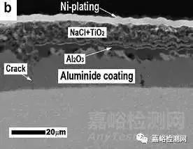 第二,在观察材料的氧化膜截面形貌时,要注意采用扫描电子显微镜的背散射模式进行观察。扫描电镜在腐蚀形貌观察时,通常有两种工作模式,一种是二次电子相模式,一种是背散射模式。二次电子相通过测试二次电子,来获得试样表面的形貌,而背散射模式则可以通过测试背散射电子,获得试样表面元素分布的情况。通过背散射模式观察腐蚀试样氧化膜界面的形貌,可以很容易地分辨出氧化膜内元素的分布,从而判断出氧化膜是单层结构还是多层结构,如图4所示。