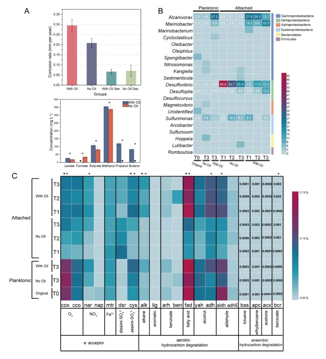 图1 | 石油污染组(With Oil)和无油组(No Oil)的(A)腐蚀失重速率(上)和小分子代谢产物浓度(下)(B)浮游及附着微生物群落组成(C)浮游及附着微生物群落的功能基因