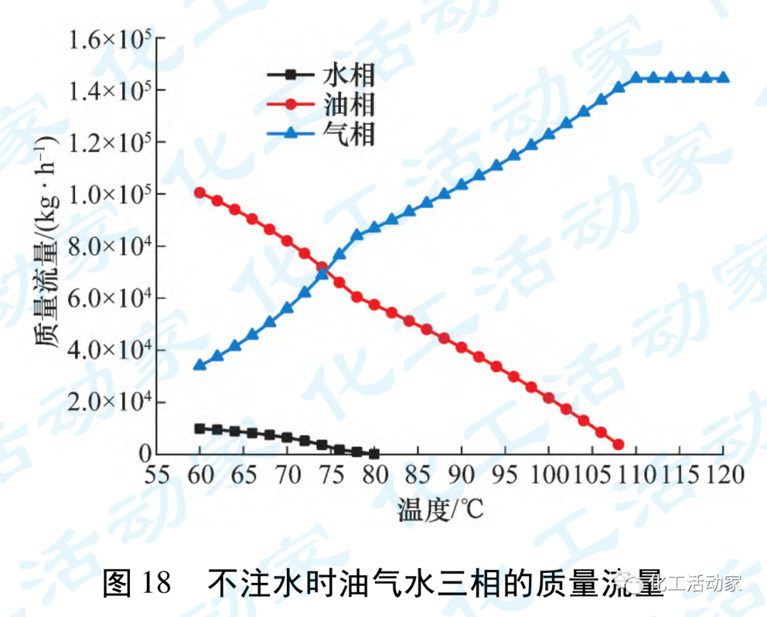 为了避免这一腐蚀风险,考虑降低露点温度,可取消换热器前部的注水,来降低流体中水蒸气分压,进而降低露点温度。图18为取消换热器前部注水后的油气水三相随温度变化的质量流量规律。