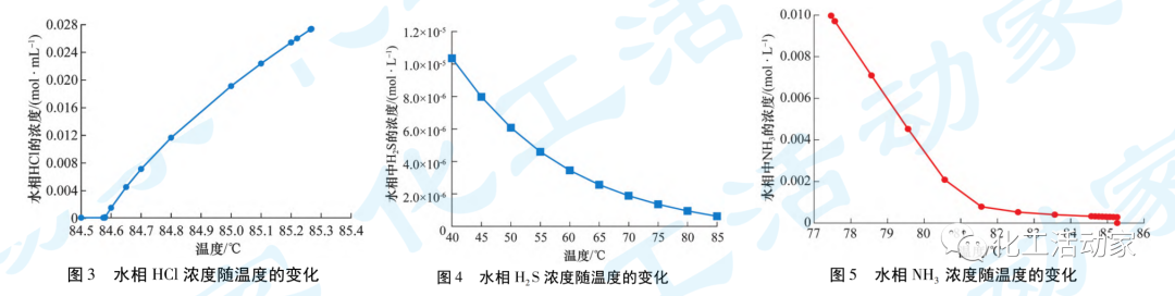 露点腐蚀是否发生与硫化氢(H2S)、氯化氢(HCl)、氨(NH3)三者在水相中溶解后浓度值密切相关。图3至图5为三种腐蚀性介质在水相中浓度随温度变化的规律。