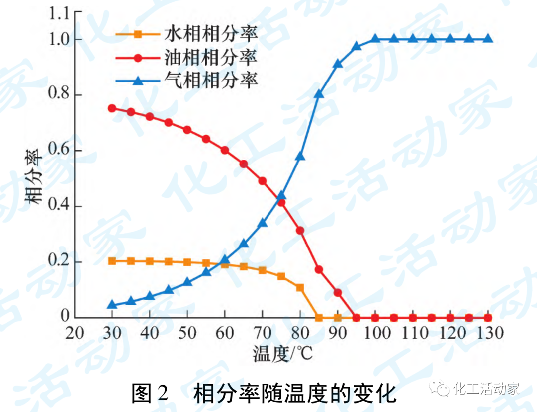 根据Aspen软件建立的运算模型,通过设置不同的温度值,能获取对应温度值下的油、气、水三相的各自相分率,进而获取三相的相分率随温度变化的趋势,如图2所示。