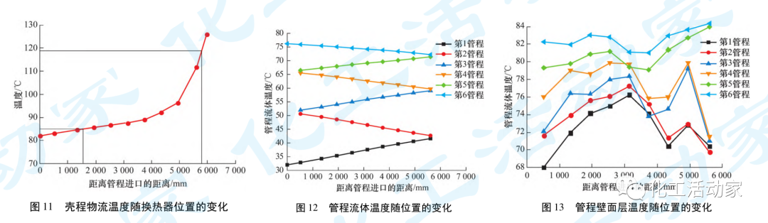 换热器内部壳程、管程和壁面层具体温度分别见图11至图13。