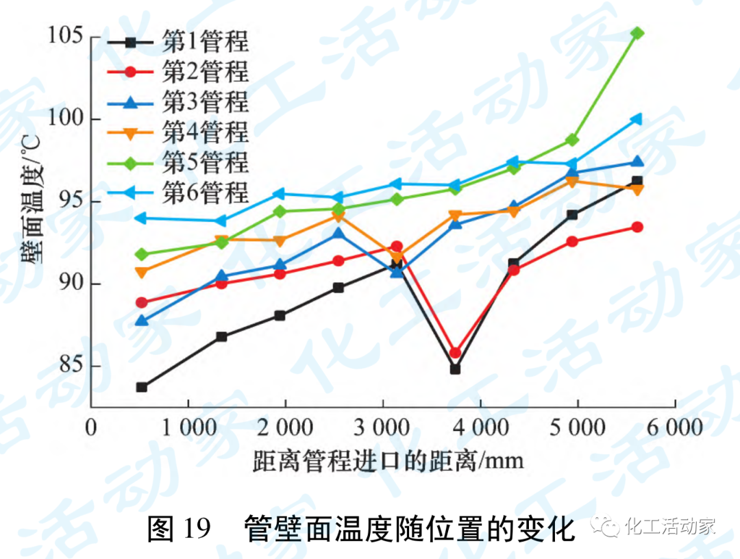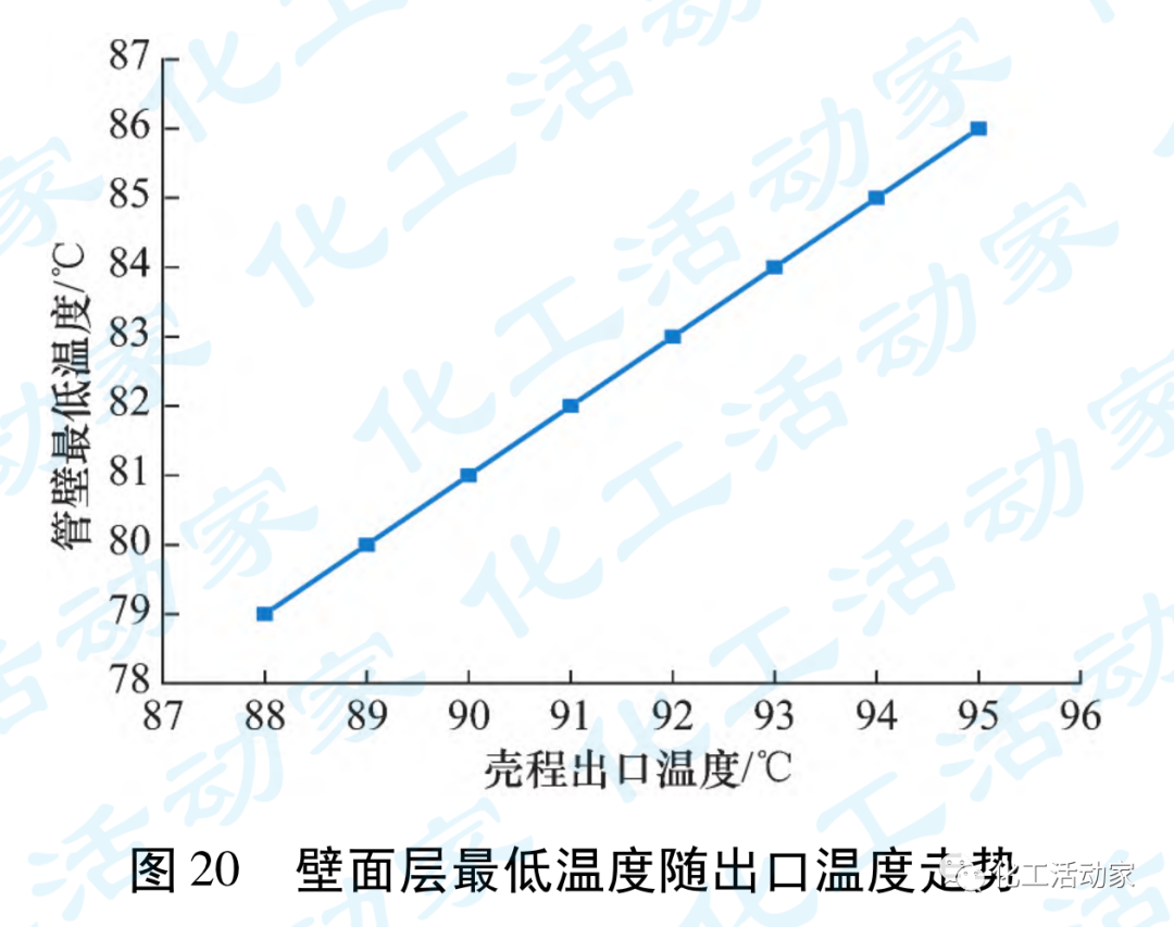 从图20看出:可将出口温度设置为89℃,就能确保壁面层温度最低值也高于80℃的露点温度,考虑到需要增加一定的操作弹性,因此,建议将出口温度升至91℃。