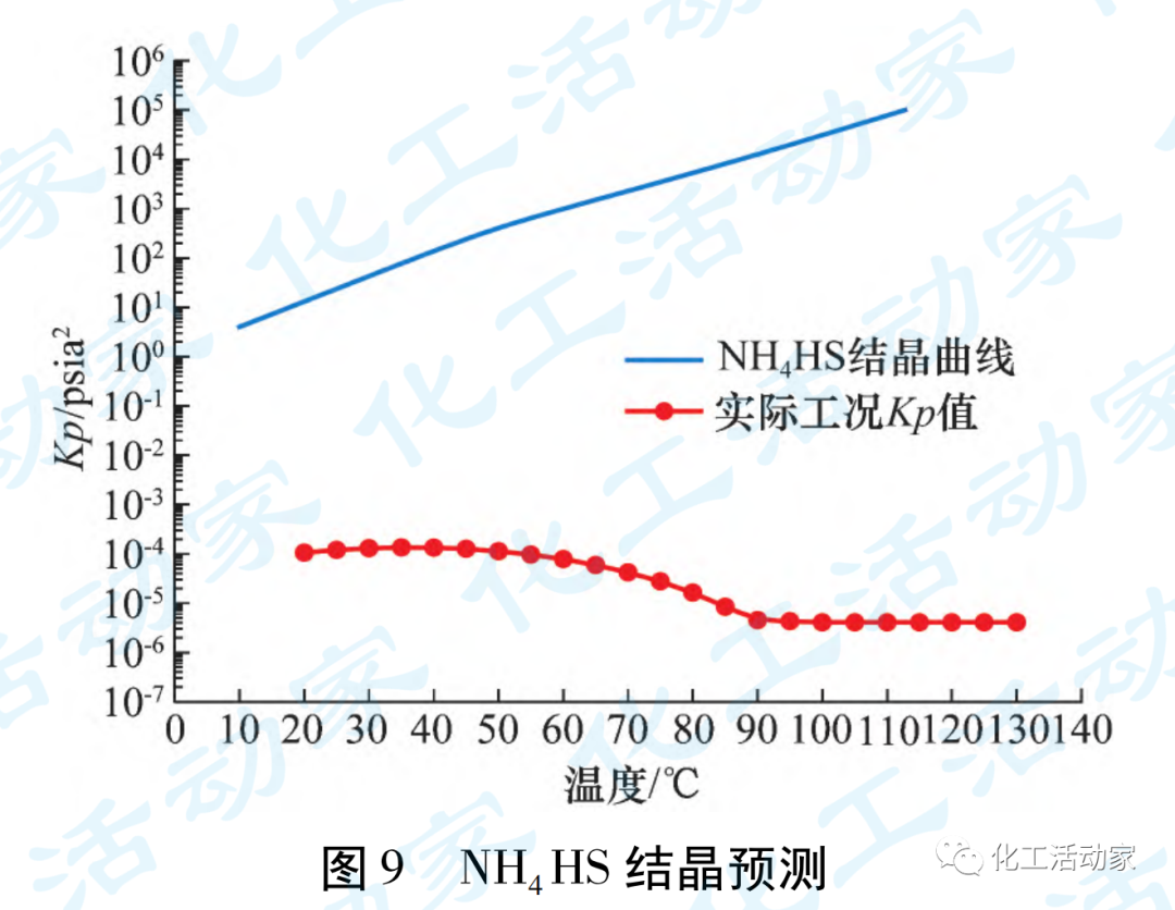 从图9看出:该工况下,Kp值曲线和NH4HS结晶曲线无交汇点,预测换热器内不会有硫氢化铵盐结晶腐蚀风险。