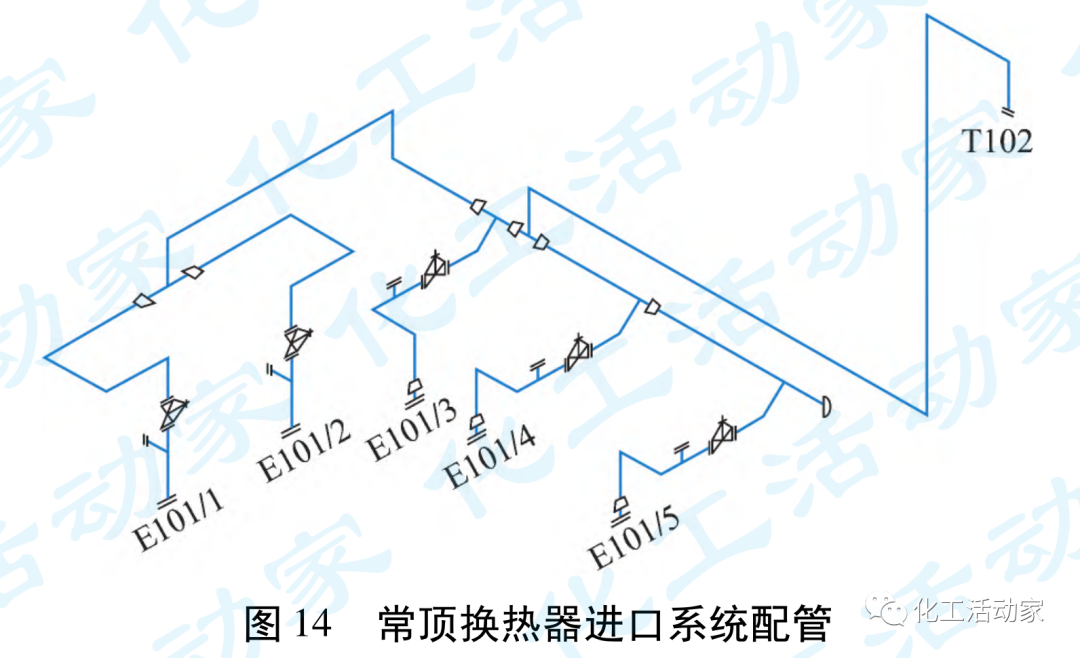 换热器系统拥有5台换热器,3台U型结构,2台板式结构,进口配管见图14。
