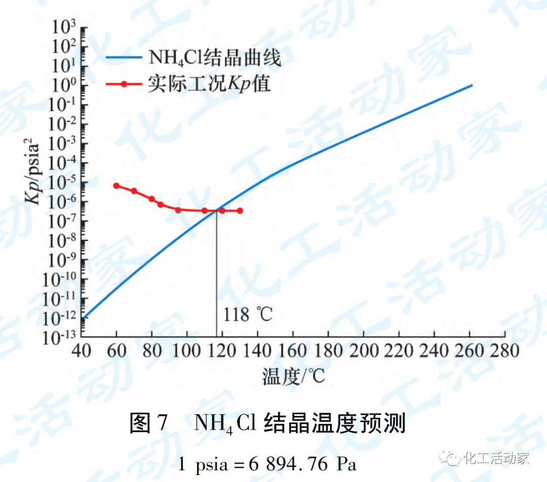 从图6看出:油相和水相出现后,HCl和NH3两者在气相中摩尔分率所占比例逐渐变大,主要是气相中有部分物质冷却变为水相和油相所致。从图7看出:Kp值曲线和NH4Cl结晶曲线相交点为118℃,而换热器操作温度区间为82~126℃,判定NH4Cl盐结晶沉积腐蚀会在换热器内发生。