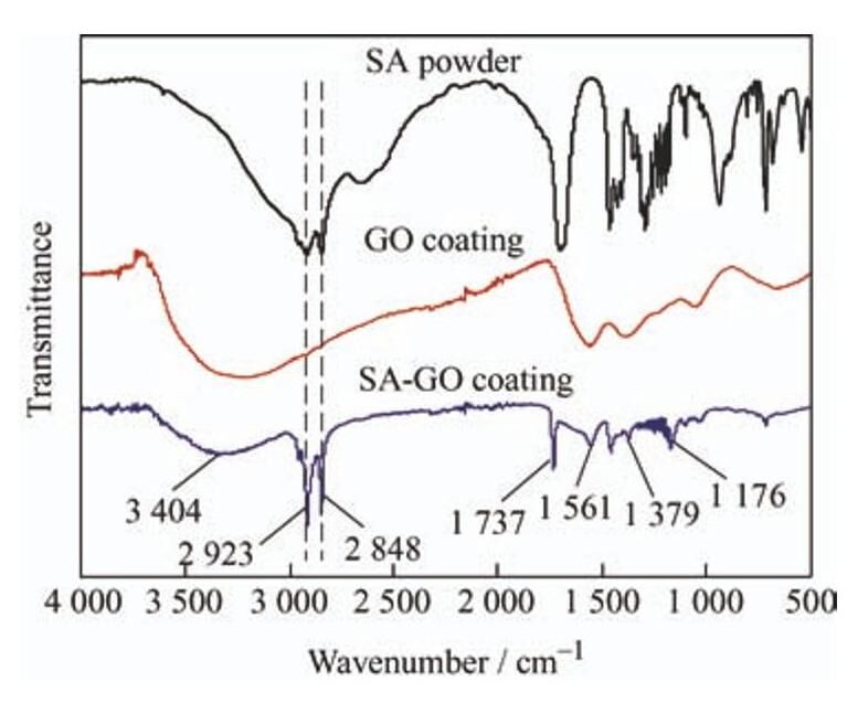 图3为SA粉末、GO涂层和SA-GO涂层的FTIR光谱。可以看到,GO涂层和SA-GO涂层在3 250~3 404cm1 的波峰处都出现宽峰,这对应于GO上的羟基的拉伸振动峰。此外,与GO涂层相比,SA-GO涂层在3 404cm -1 处的峰强度减弱,这与接枝SA有关,使其表面羟基减少。SA-GO涂层在2 923cm 1 和2 848cm 1 处的峰分别对应于-CH2-的不对称和对称拉伸振动峰。SA-GO涂层在1 737cm 1 处的强峰归因于改性后C=O的对称拉伸振动 [29]。在1 561cm 1 和1 379cm 1 处出现的峰对应于涂层和基材之间羧酸盐的形成,这两个峰对应于结构的反对称和对称拉伸振动[20]。因此,SA成功接枝到GO的表面。