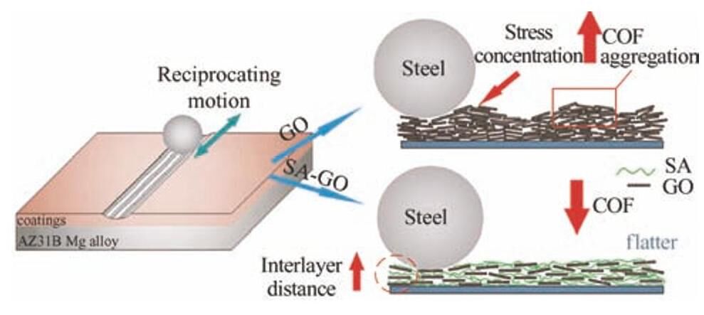 (2)SA-GO复合涂层表现出优异的摩擦学性能,显著降低了镁合金的磨损率。这与SA分子自润滑性能以及在接枝SA后GO层间距增加,并导致GO片层更易滑移并填充到磨痕表面有关。