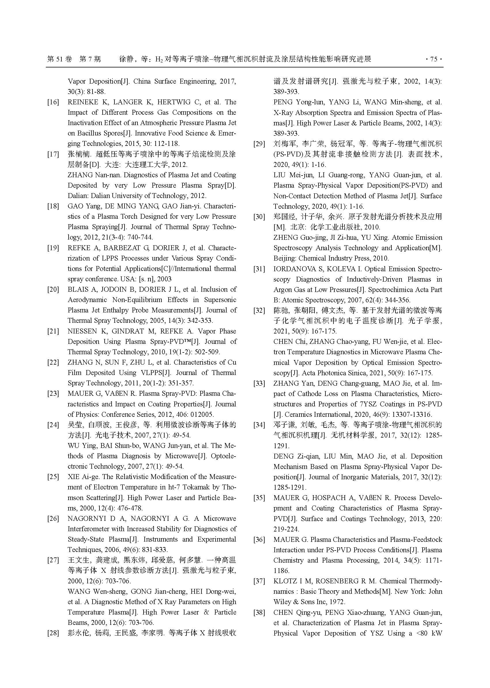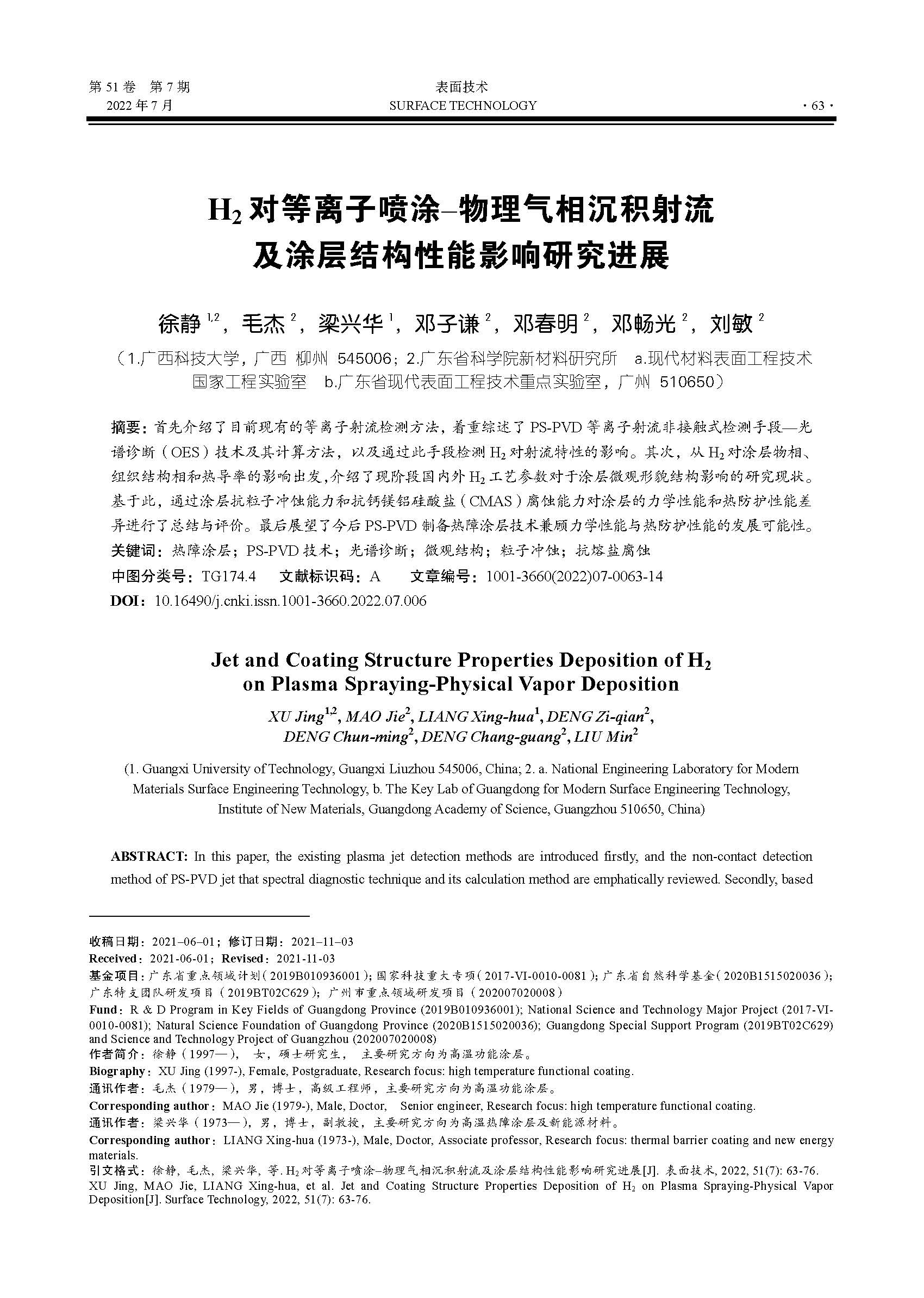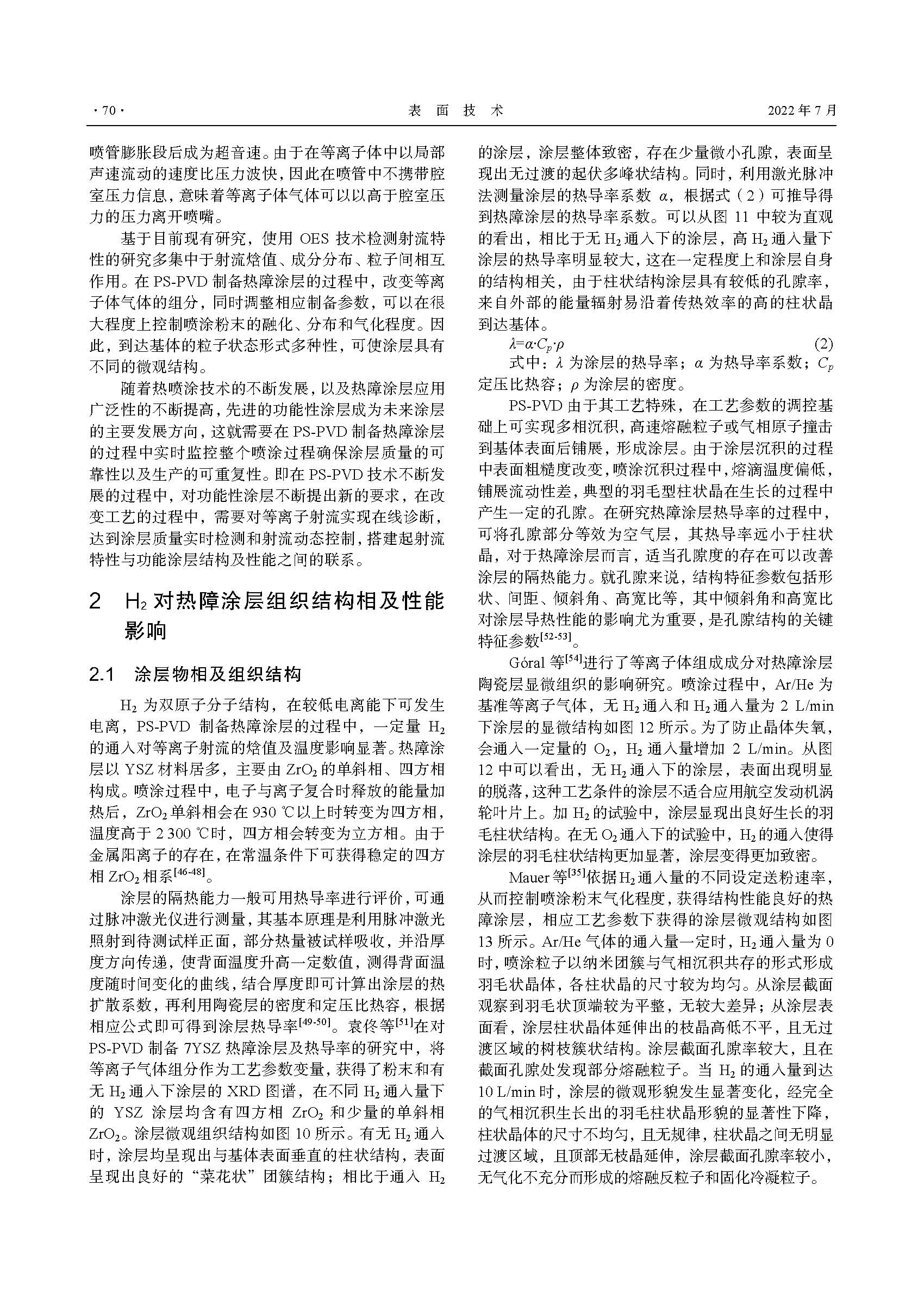 H2 对等离子喷涂–物理气相沉积射流及涂层结构性能影响研究进展