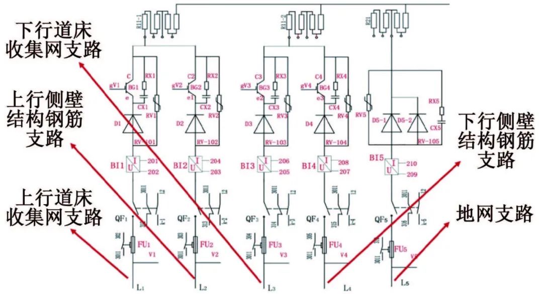 地铁排流柜内部结构如图5所示,共设置5条支路,分别连接上下行道床收集网、上下行侧壁结构钢筋和接地网。