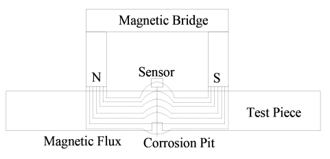 漏磁检测(MFL)使用漏磁通原理:利用设备对被测件进行饱和磁化,在其内部产生磁场。当存在缺陷时,会导致缺陷处附近的磁场发生畸变,部分磁力线将穿出试件产生漏磁,通过磁敏探头检测漏磁场就可以发现管道缺陷。